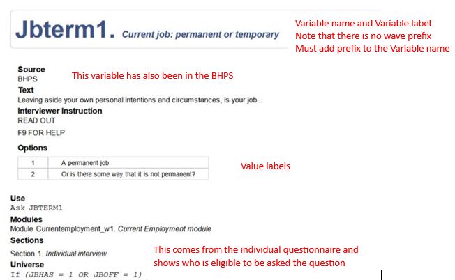 The questionnaire tells you what to expect, for example, it will tell you why there are missing cases and why some questions return multiple variables. These are explained with some examples below. Note the variable names in the questionnaire do not contain the wave prefix that is applied in the data files.