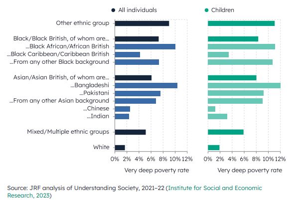 When they looked over time, JRF found that although poverty rates for people in Bangladeshi and Pakistani households were higher than for other groups, the poverty rate for these households has fallen over the last 20 years. Twenty years ago, the majority of people in households headed by someone with a Bangladeshi (72%) or Pakistani (58%) back ground were living in poverty, while it is close to a half for both groups today. In contrast, poverty rates for Black African households have changed little over time, remaining at around 40%, while white households have a poverty rate of around 20%.